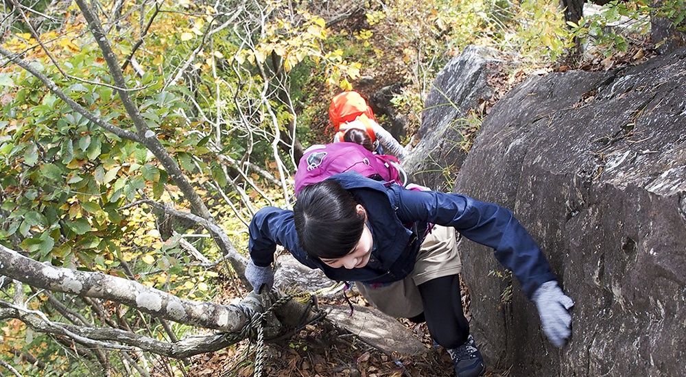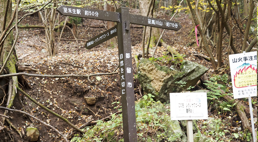 禾生駅から古宿集落まで約30分車道を歩きます。集落を過ぎたら山道に入り、少し歩くと分岐に出て、シラノサワコースと古宿コースに分かれます。古宿コースは山頂まで70分、シラノサワコースは90分と時間的には少しかかりますが、展望はシラノサワコースのほうが良いです。ただしシラノサワコースは山頂直下に大岩があり、そこを登らなければなりません。不安な人は古宿コースから登りましょう。ここではシラノサワコースを進むことにします。少し沢沿いを歩きますが、すぐに外れて尾根に取り付きます。尾根道からは富士山が樹林の間から見えるようになってきます。徐々に高度を上げ、トラロープのぶら下がった大きな岩場が見えてきたら山頂はもうすぐです。360度の展望を満喫したら、山頂から北東側にのびるルートを下ります。山頂から道標に従って下ると狼煙台跡があり、その先で分岐になります。今回は中谷入・古宿の道標に従いリニア見学センターを目指します。いくつかロープも出てきますので慎重に下ります。再び分岐にぶつかりますが、左の中谷入方面に向かいます。(右方面は古宿から禾生駅方面)。丸木橋を渡り、急坂が終わると林道に出ます。中谷の町に入り10分ほど歩くとリニア見学センター到着です。道の駅つるまではすぐです。道の駅つるで一休みして地産のお土産などをお楽しみください。